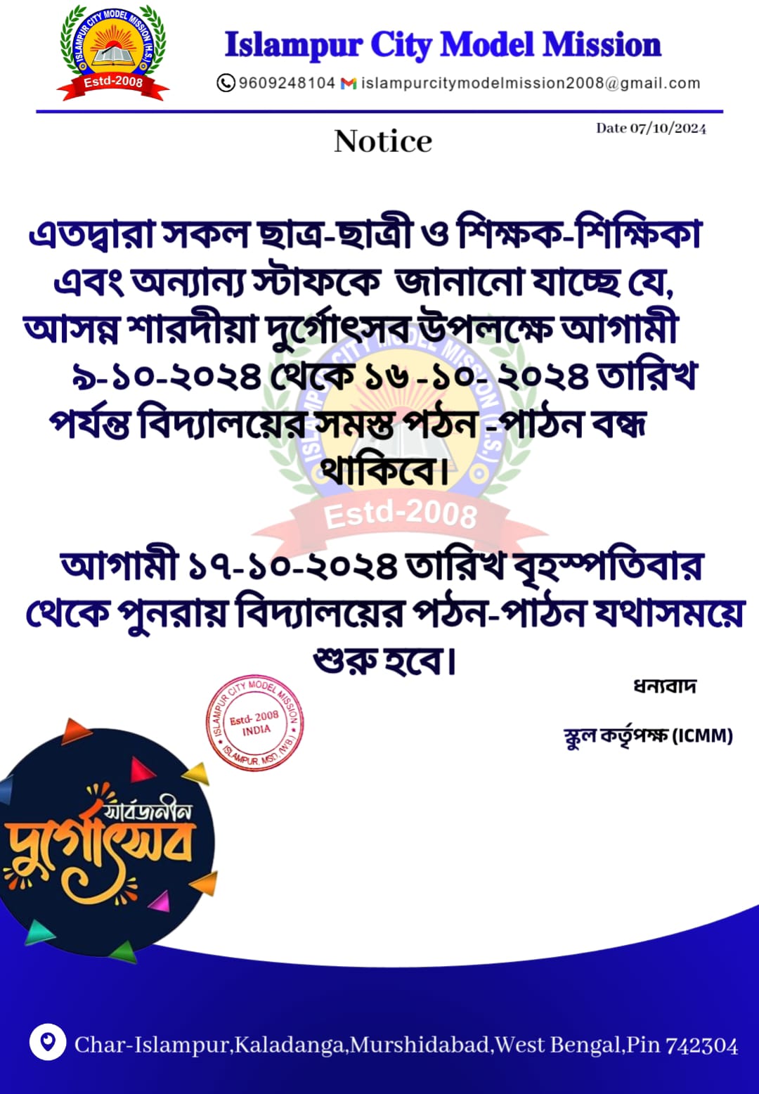 Islampur City Model Mission was established in 2008.